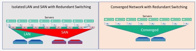 Why converge though? It’s all about a tradeoff between cost and performance. If we do the math to compare the cost of deploying separate LAN and storage networks versus a converged network, we can see that converging I/O greatly reduces the complexity of the infrastructure and can reduce acquisition costs by half. There are additional long-term cost savings also, associated with managing one network versus two.