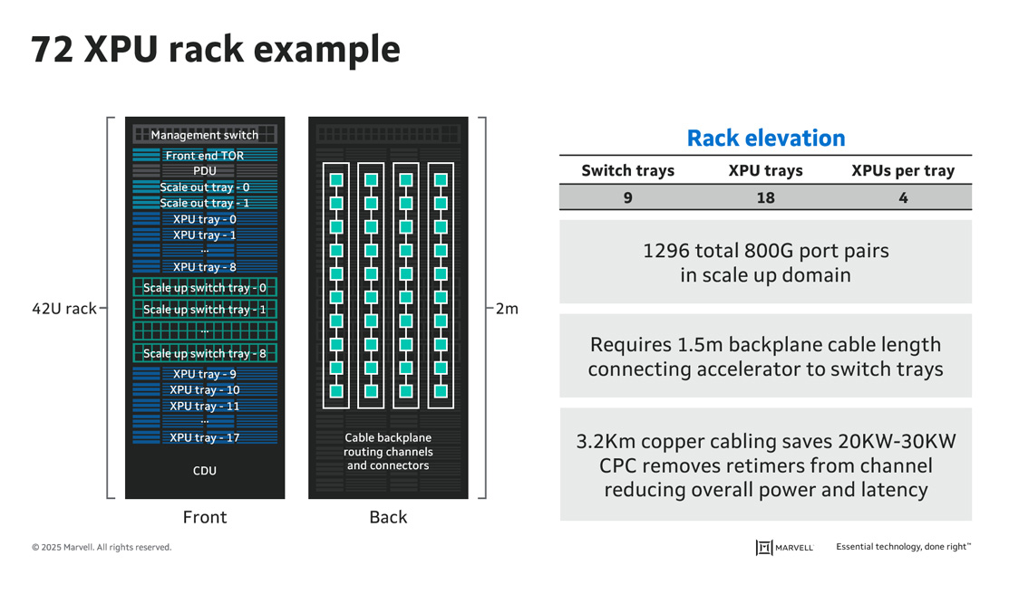 A standard 72-XPU rack contains ~1,300 connections. A complete row, which usually contains ten racks, would have 13,000 connections that would collectively run for 30 kilometers and need 200-300kW. (Marvell estimates from industry averages)
