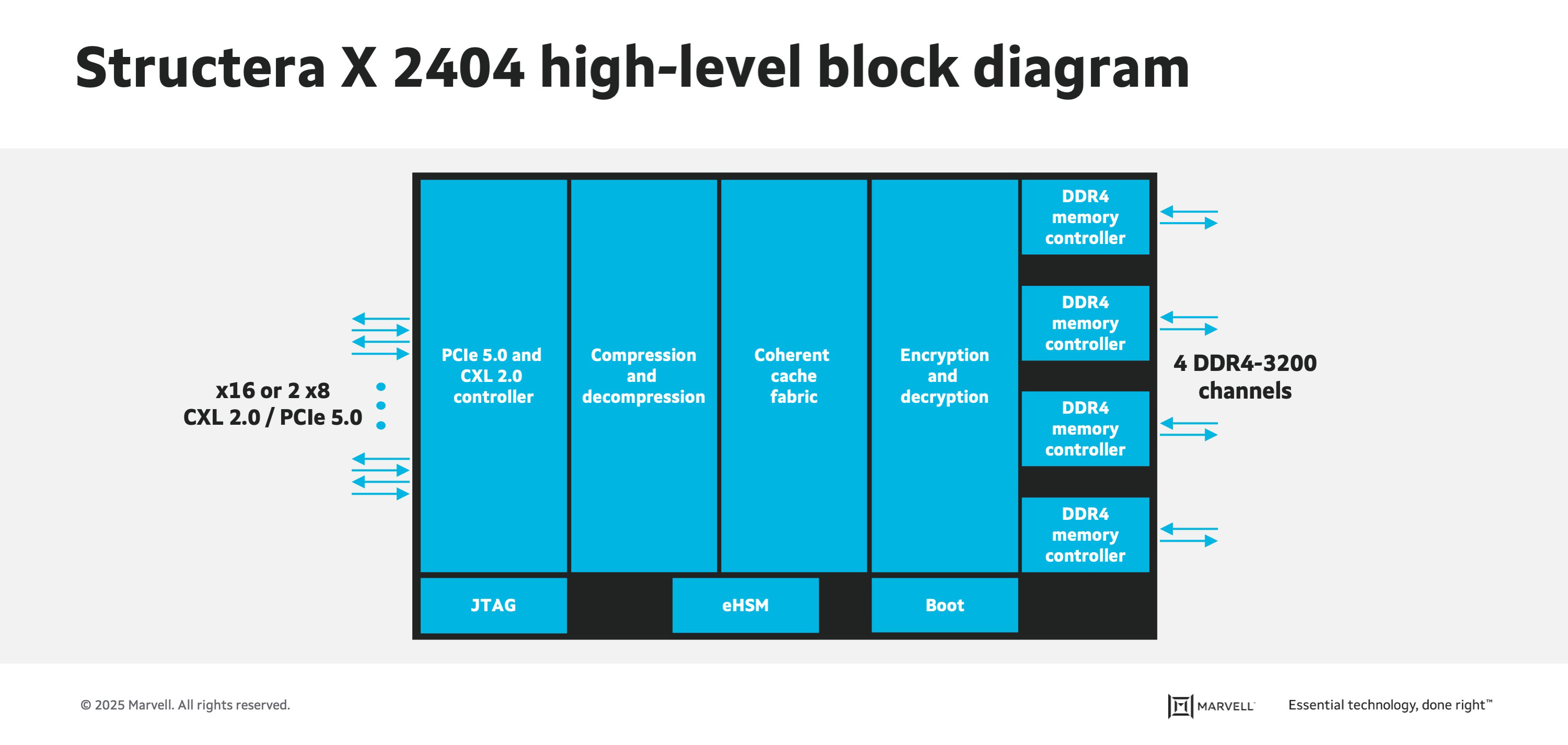 Marvell Structera X is the industry’s first CXL memory expander with 4 DDR4 memory controller channels that support 3 DDR4 DIMMS per channel. In other words, it lets you add 12 DIMMs to complement the 8 DIMM slots natively supported by the processor for 6TB of capacity with 512GB DIMMS. Structera X also features LZ4 compression, again a first, that can double the amount of memory accessed to 12TB.